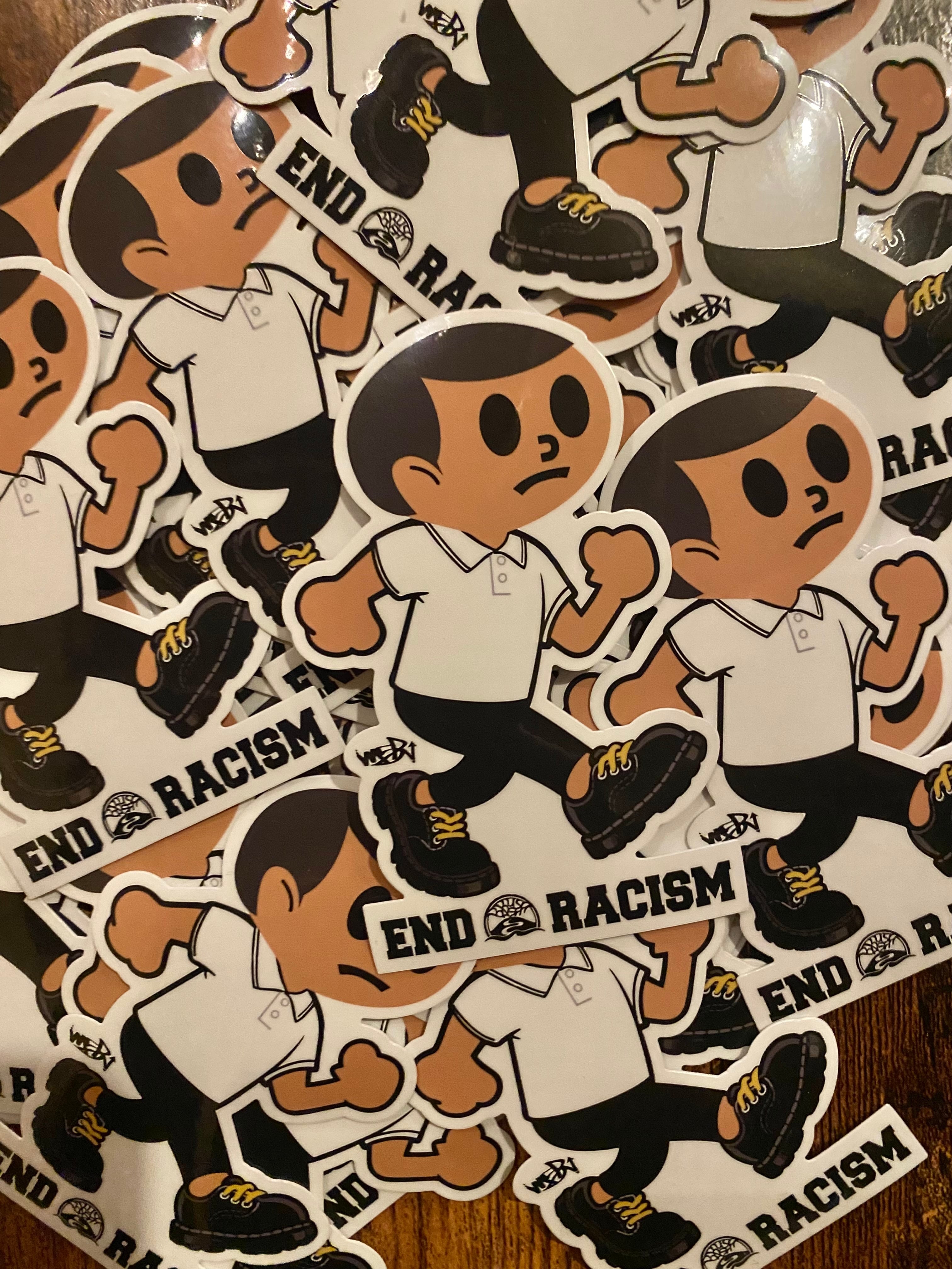 「MSR TOKYO」にデザインして頂いた最高のEND RACISM stickerが到着です。今作はBUSHBASHとMSR TOKYOによる"しっと君"コラボのANTIFA SKINHEADS仕様ステッカー。